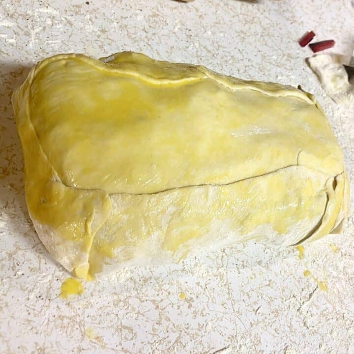 - Pull the long sides of the puff pastry up and press the edges together in the middle, brushing the inside with egg wash to help with adhesion.
